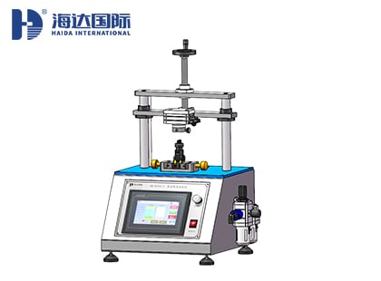 將樣品固定于本機夾具上(帶電測試樣品需要鎖緊快速插頭),扭緊螺桿把手使樣品固定。旋轉(zhuǎn)氣缸則在調(diào)好適當(dāng)高度情況下,往復(fù)旋轉(zhuǎn)按鈕,直到樣品損壞,記錄點動次數(shù)。