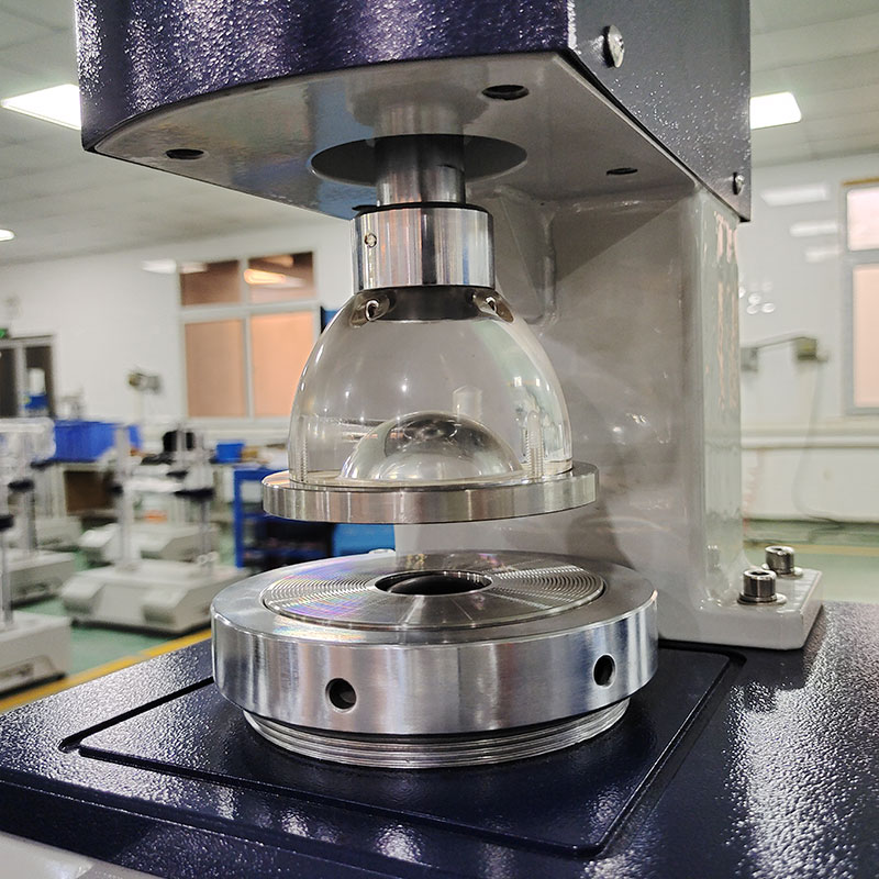 在儀器密封的油缸和壓紙座的容腔內,裝滿甲基硅油作為壓力傳遞的介質,當電機帶動活塞勻速前進時,橡皮膜受到硅油的加壓而突起,此時夾持在膠膜上方,被上下夾盤固定住的試樣,均勻受力,直到試樣破裂,處理芯片鎖住最大壓力值,通過液晶屏顯示該壓力值,此壓力值即為本次試樣的耐破度。
