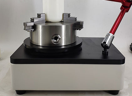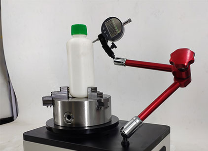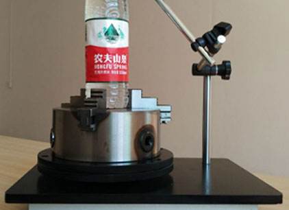 將瓶底加持固定在水平板的旋轉盤上,使瓶口與千分表接觸,旋轉360°讀取最大值和最小值,二者之差的1/2即為垂直軸偏差數值。儀器利用四爪自定心卡盤同心度高的特點,配合一套可以自由調節高度和方位的高自由度的支架,可以滿足各類玻璃瓶及塑料瓶檢測。