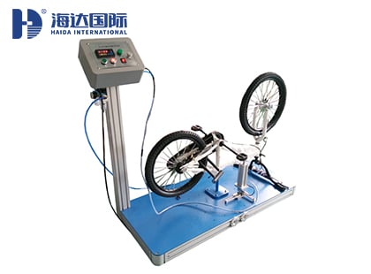 海達(dá)儀器HD-S518自行車驅(qū)動系統(tǒng)靜負(fù)荷試驗機(jī),主要測試自行車驅(qū)動系統(tǒng)的靜態(tài)強(qiáng)度,取左曲柄處于向前、水平位置,在左腳蹬的中心垂直向下施加一力F,逐漸達(dá)到1500N,保持1min(GB為15S)。 萬一在負(fù)荷的作用下,由于系統(tǒng)屈服或驅(qū)動鏈輪張緊而使曲柄轉(zhuǎn)過水平面以下30°位置時,將曲柄重新回到水平位置,或者考慮到系統(tǒng)的屈服,而將曲柄置于水平面以上某個位置,再重復(fù)試驗;在完成左曲柄的試驗之后,應(yīng)將右曲柄取向前水平位置,并將力施加在右腳蹬上,重復(fù)該試驗。